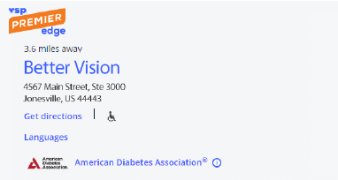 Available to all VSP network practices, this badge indicates that a location has completed any diabetes-related courses and is committed to supporting patients’ overall health, as well as their vision. Courses are guided and developed by the Clinical Advisory panel at the ADA made up of optometrists and a range of clinical experts.
